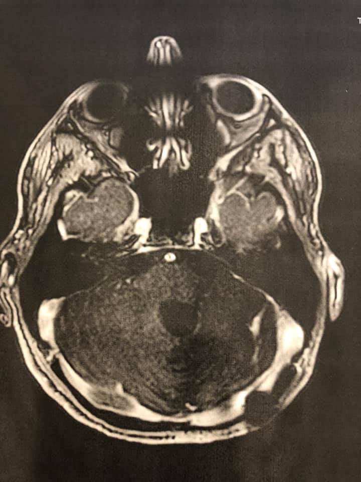 Here are the two pics from 2013 scan to today’s. The first picture shows the white portion next to the gray section in the middle of the head is the remaining tumor back in 2013. Today’s scan — the picture on the right— doesn’t show it there anymore!